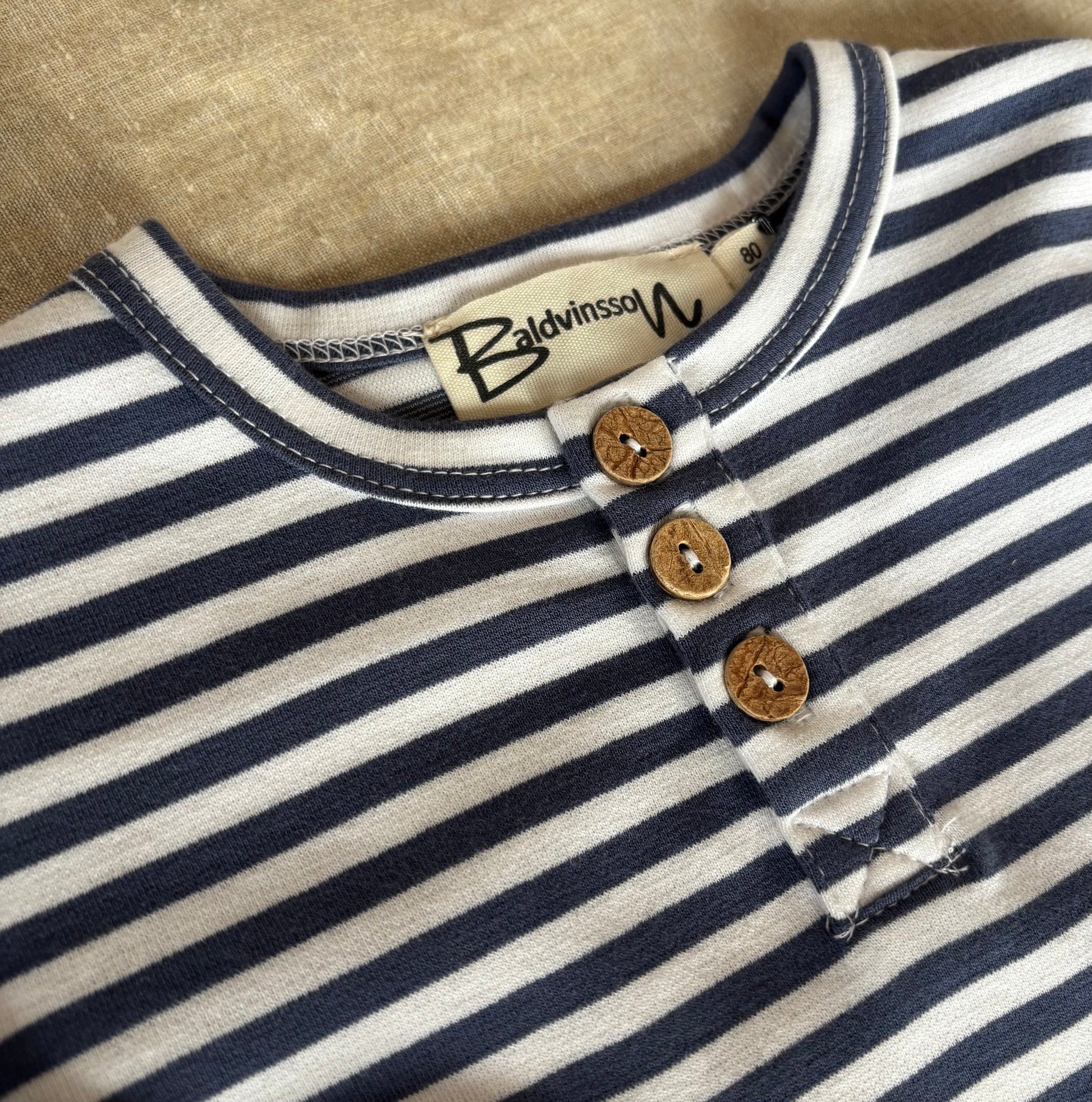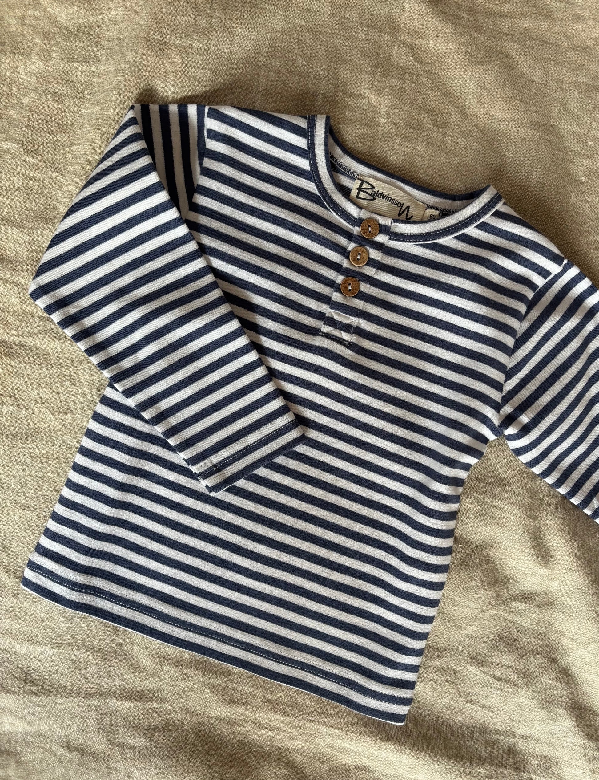 Langærmet T-shirt med blå og hvide striber og kokos knapper.